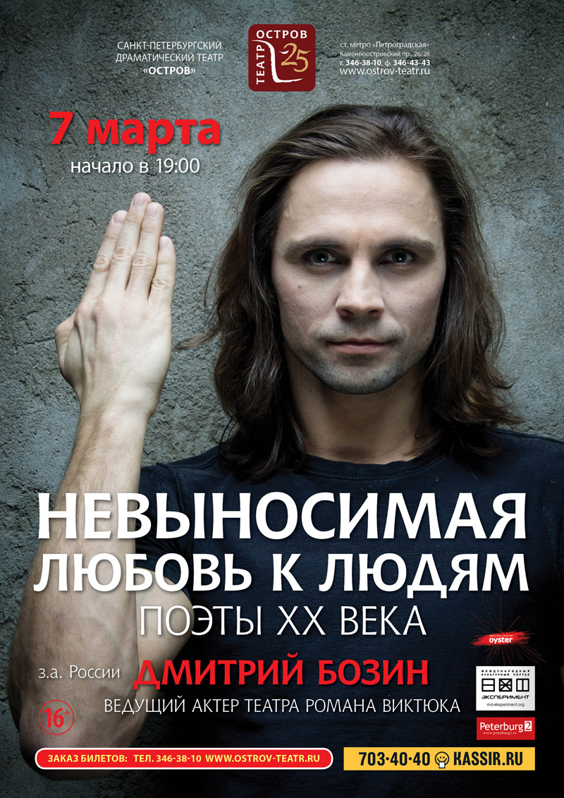 Авторская программа Дмитрия Бозина «Невыносимая любовь к людям» (поэты XX века) будет представлена в Петербурге на сцене драматического театра «Остров».