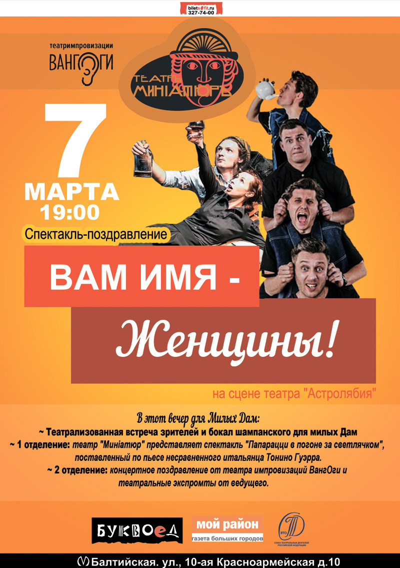 7 марта, 19.00, театр "Минiатюр" поздравляет всех женщин с 8 марта и приглашает Вас на Спектакль-поздравление "Вам имя - Женщины!"