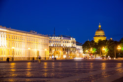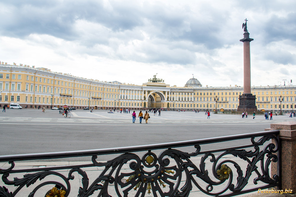 Ее северным рубежом является Зимний дворец, южным – полукружие здания Главного штаба с прорезной Триумфальной аркой, восток обрамляет здание Штаба Гвардейского корпуса. Визуальным центром Дворцовой площади является Александровская колонна.