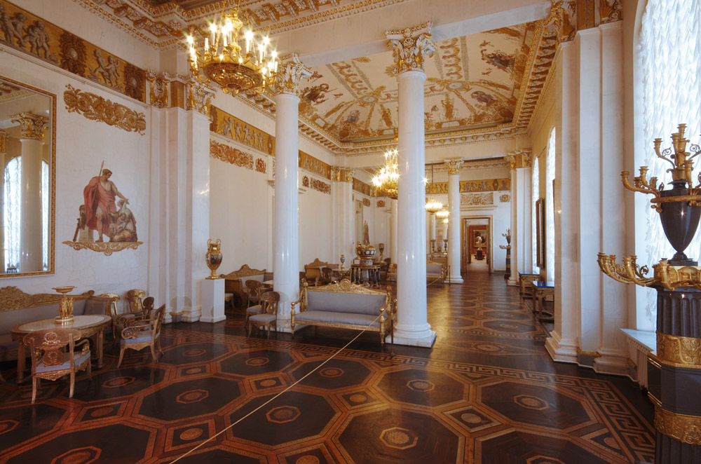 Над Михайловским дворцом К.Росси начал работать с 1817года, закладка здания происходила двумя годами позже (1819), в 1823году было закончено основное строительства, а в1825 – отделочные работы. Роскошь и прелесть убранств интерьеров Михайловского дворца обошлась много дороже, нежели все строительство. Ценные породы дерева, шедшего на паркет в залах дворца, обусловили его значительную стоимость - 160 рублей за квадрат. В мастерах у Росси тогда были одни из лучших художников, скульпторов, резчиков и мебельщиков.
