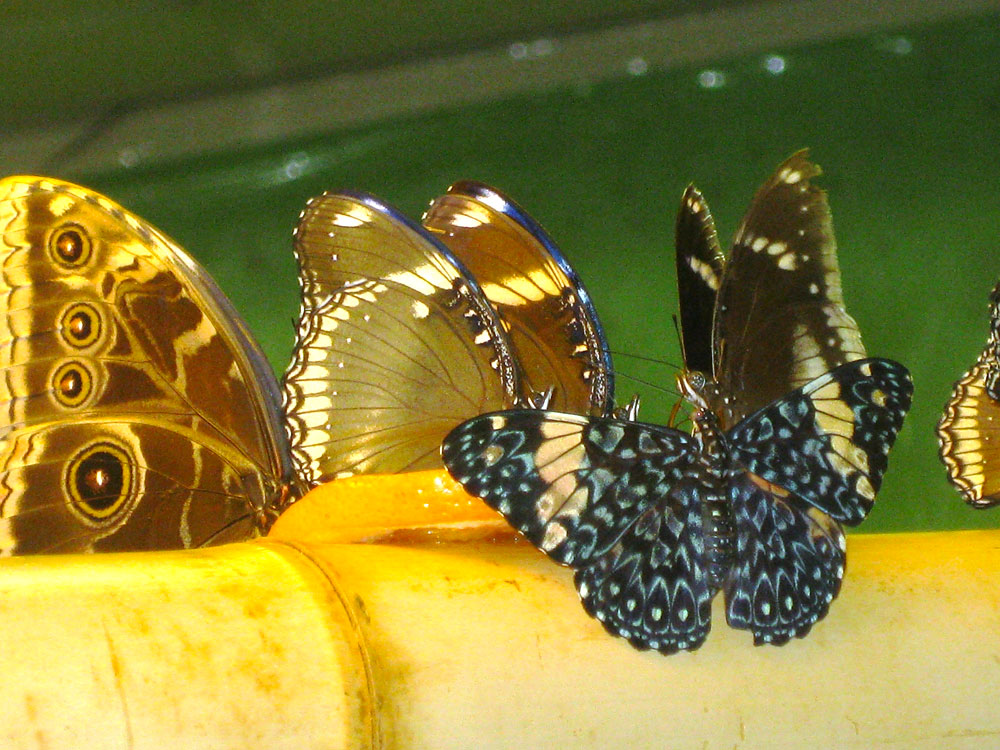 Вокруг разложены излюбленные лакомства - дольки апельсинов, кусочки бананов. Кормить бабочек посетителям категорически запрещено, как и трогать руками, но на бабочек не действуют эти ограничения. Они совершенно свободно летают и садятся на головы, плечи людей, особенно на ярко одетых детей, что приводит маленьких посетителей музея в полный восторг . Можно внимательно рассмотреть их с близкого расстояния, полюбоваться игрой красок на трепещущих крыльях, поймать удобный момент и сфотографироваться с необыкновенно красивой бабочкой на фоне экзотических растений. Правда условия, созданные здесь, не привычны для жителей северной страны, дышать при такой влажности тяжело, поэтому находиться долго в помещении нельзя. Но даже за короткое время можно насладиться красочным и ярким зрелищем.